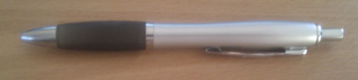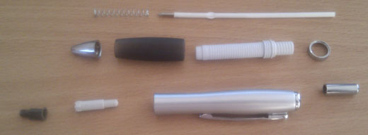 This is another rare speciement. With both a comfort grip and a removable ring you will get hours upon hours of fun with this pen. Notice that you have to turn the clicker in order to disassemble it completely, since it is screwed on to the little white part.